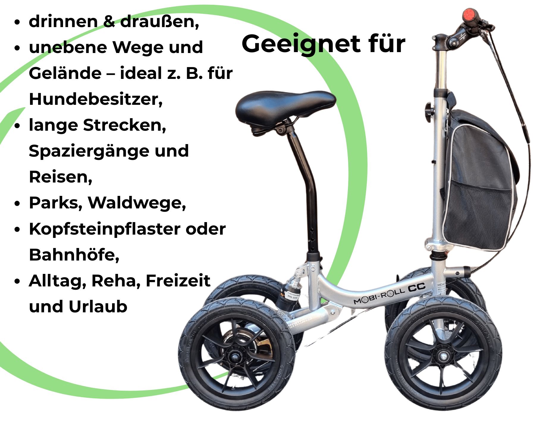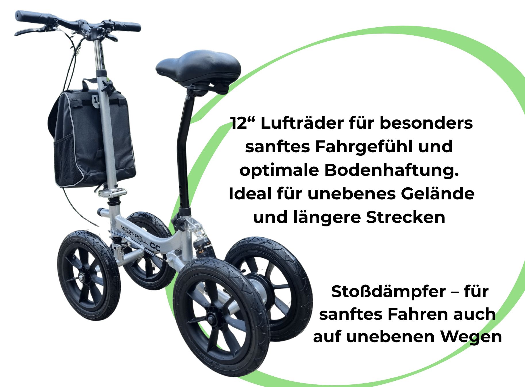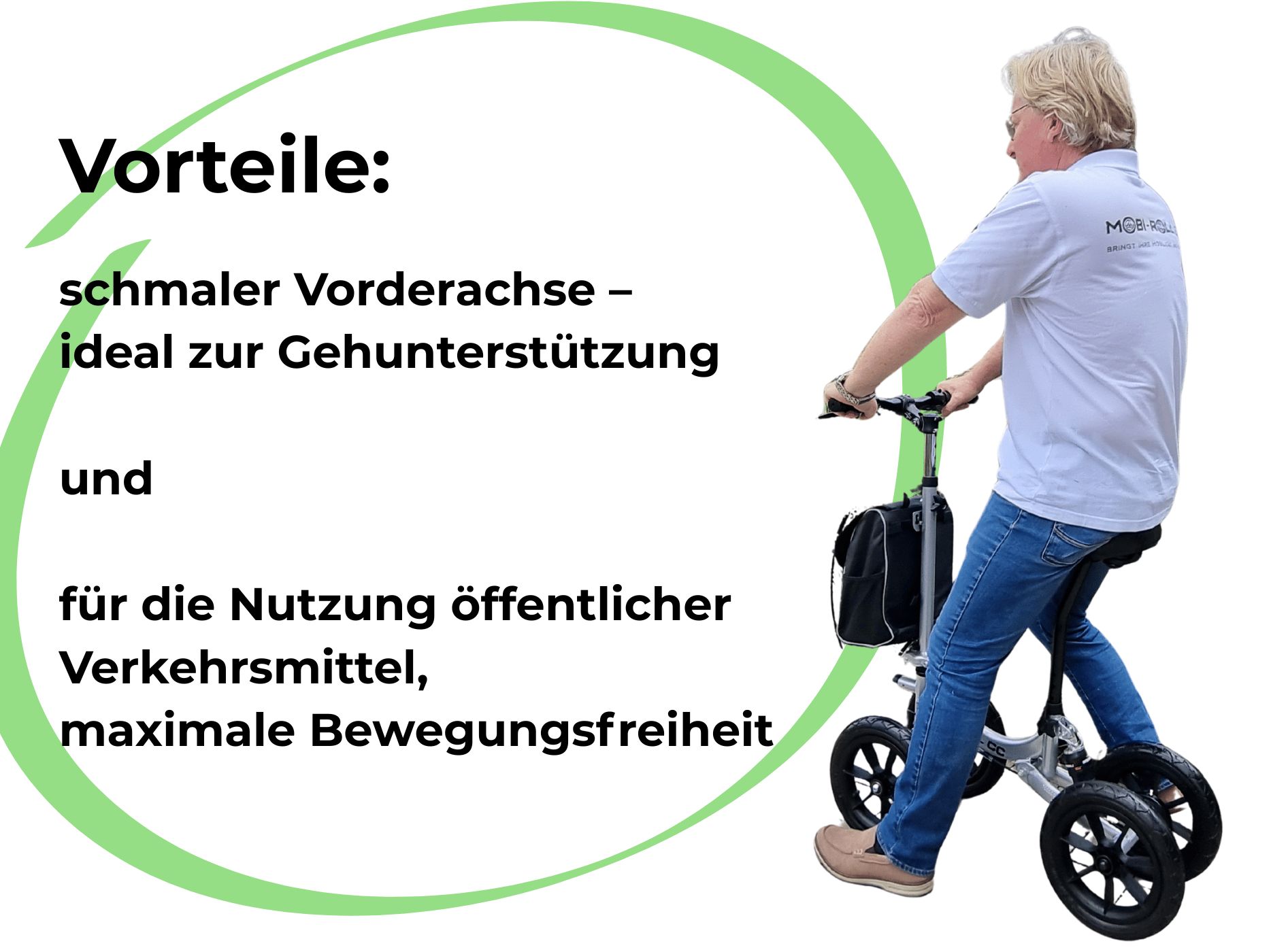 Der Mobi-Roll MRW 25 CC ist eine speziell entwickelte Mobilitätslösung für Menschen mit eingeschränkter Beinkraft, Gleichgewichtsstörungen oder Arthrose. Er ermöglicht sichere und selbstständige Fortbewegung und stellt für viele Nutzer eine langfristige Alternative zum Rollator dar.